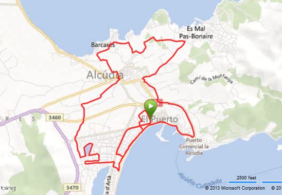 Recorrido: El recorrido se realizará en un circuito por el Pto. Alcudia y caminos de Alcudia; la salida y la meta estarán situadas frente a la entrada del Hotel apartamentos Alcudia Garden en la Avd de la Playa nº1 del Pto. Alcudia. Se tendrán que realizar 1 vuelta para completar la distancia homologada de 21.097 metros. En la zona de Meta estará situada la zona de servicios ( guardarropa, servicios, bar, etc.) El circuito estará completamente cerrado al tráfico y señalizado con conos y cinta.