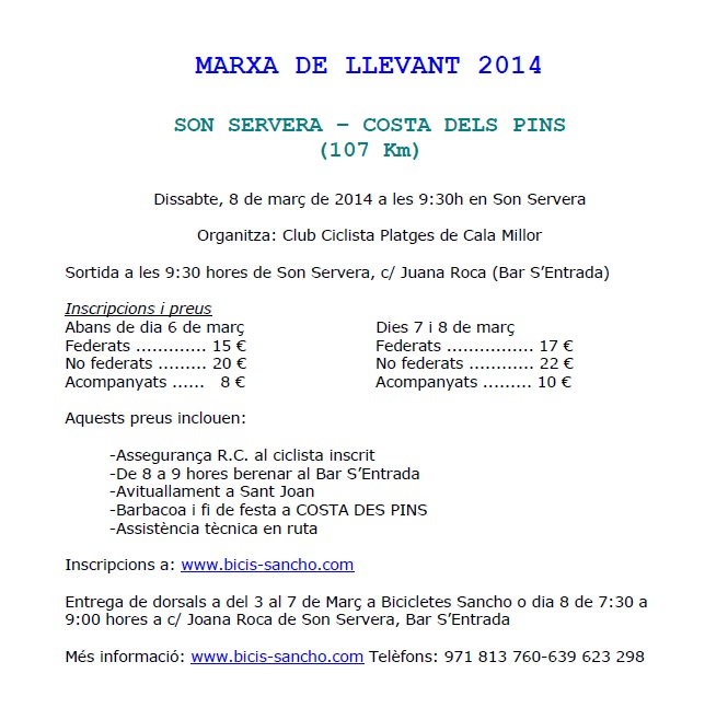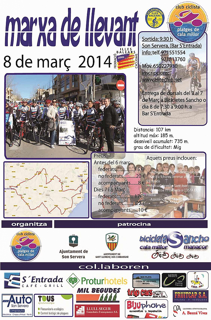 Entrega de dorsals a del 3 al 7 de Març a Bicicletes Sancho o dia 8 de 7:30 a 9:00 hores a c/ Joana Roca de Son Servera, Bar S’Entrada