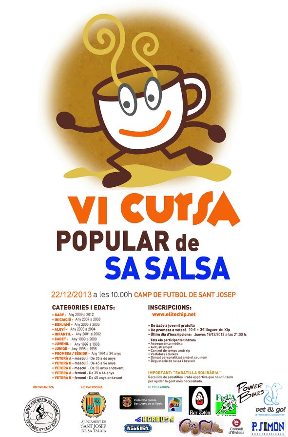 ART. 1- El Grup Esportiu es Vedrà, en colaboración con el ayuntamiento de Sant Josep de sa Talaia, organizan la VII Cursa popular de sa Salsa, con carreras de promoción para todas las edades y una prueba en ruta de 6 km. en el campo de fútbol de san José el domingo 21 de diciembre de 2014 a las 10 de la mañana , la salida de la prueba reina será a las 11:15 horas.