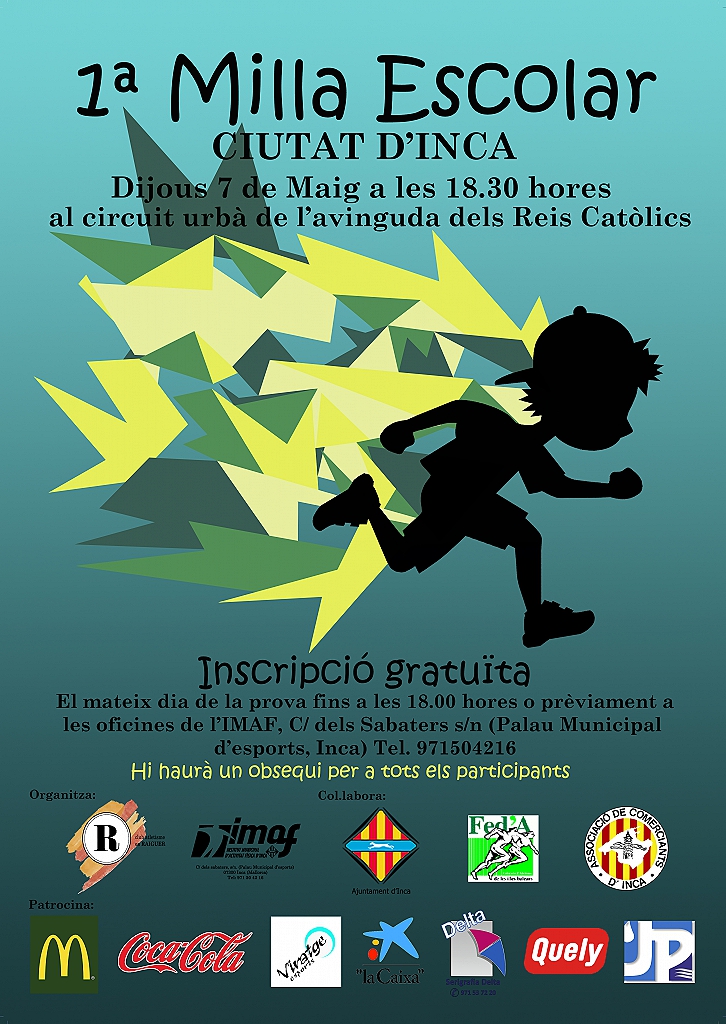 1. El C.A. Es Raiguer-IMAF organitzen la 1ª Milla Escolar CIUTAT D’INCA, que tindrà lloc el proper dijous 7 de maig, a les 18.30 hores, al circuit urbà de l'Avinguda dels Reis Catòlics.