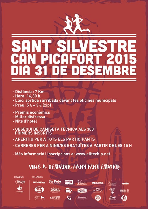 1. La III Sant Silvestre Can Picafort 2015, organitzada per l’Ajuntament de Santa Margalida, delegació de Can Picafort i l’empresa NADRI EVENTOS DEPORTIVOS, tendrà lloc el dijous 31 de desembre, a les 16,30 h., amb sortida i arribada a davant les oficines municipals de la Delegació de Can Picafort, que estan situades a la Plaça Enginyier Gabriel Roca.