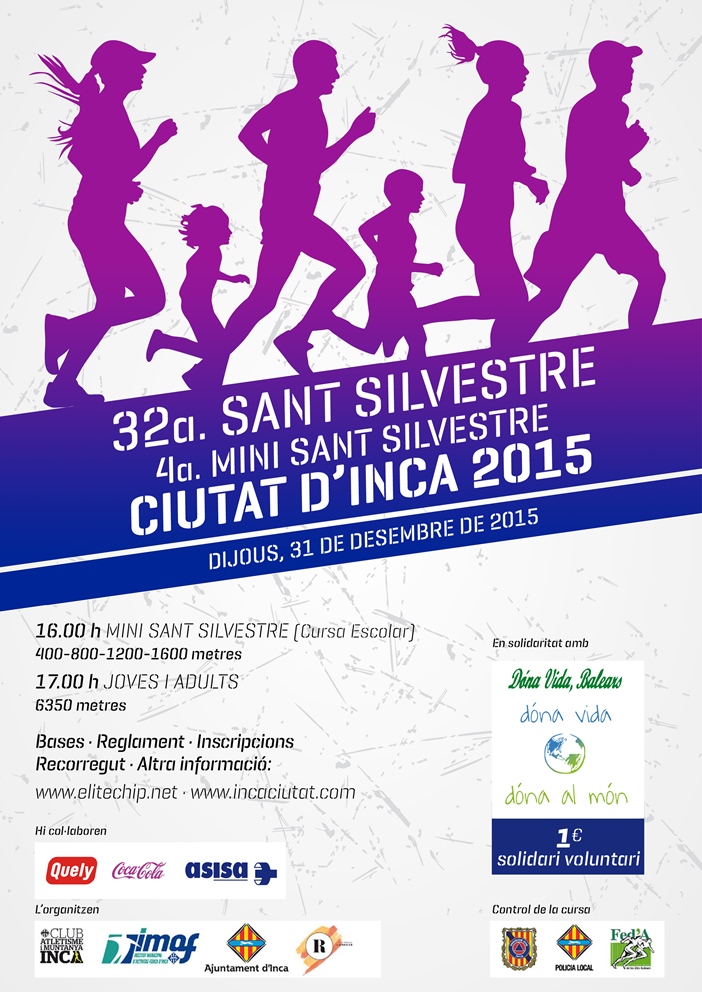 1. La 32a Cursa Popular Sant Silvestre Ciutat d'Inca 2015, organitzada per l’IMAF de l’Ajuntament d'Inca, tendrà lloc el proper dijous 31 de desembre, amb sortida des del Poliesportiu Municipal Mateu Cañellas i arribada al mateix lloc.