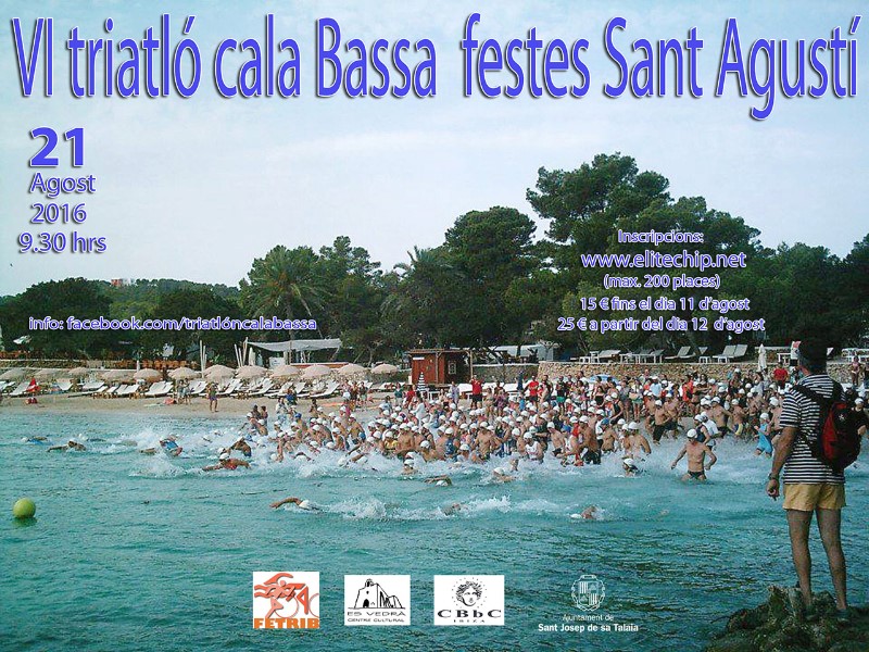 - Las distancias del VI Triatlón Cala Bassa Festes de Sant Agustí serán de 750m de natación, 13km bicicleta de montaña y 4km carrera a pie.