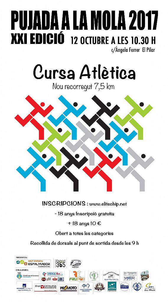 La prova anomenada “PUJADA  A LA MOLA”, es celebrarà Al Pilar de la Mola, localitat de  Formentera el 12/10/2017 a les 10:30, i es tracta d’una prova de atletismo de montanya de 7,5kms de distancia i FEDERADA a la FAIB.