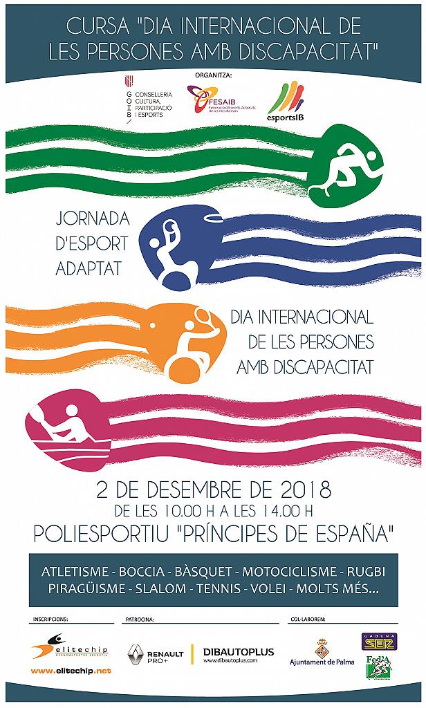 Art. 1. Organización. – Organiza Federació d'Esports Adaptats de les Illes Balears (FESAIB), Avda. Uruguay s/n (PALMA arena), 07010 Palma, CIF G57393050,promovida por Elitechip S.L., bajo la Dirección Técnica del Club Marathon Mallorca de la I CURSA "DIA INTERNACIONAL DE LES PERSONES AMB DISCAPACITAT”,que se celebraráel próximo día 2 de diciembre de 2018 en el horario que se indica:
