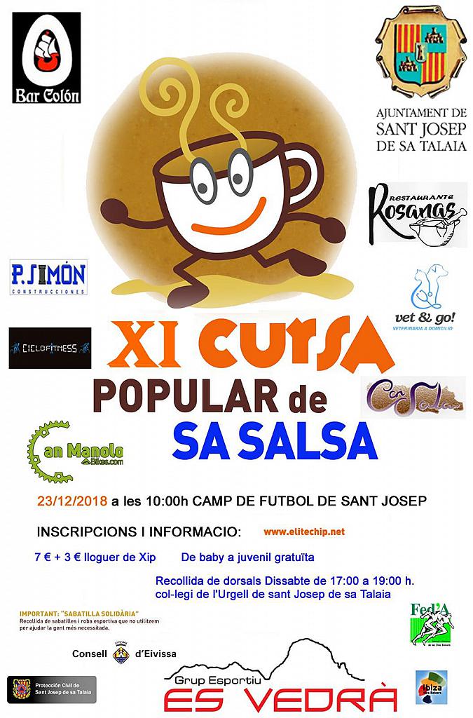 ART. 1- El Grup Esportiu es Vedrà, en colaboración con el ayuntamiento de Sant Josep de sa Talaia, organizan la XI Cursa popular de sa Salsa, con carreras de promoción para todas las edades y una prueba en ruta de 6 km. frente a la piscina de san José el domingo 23 de diciembre de 2018 a partir de las 10h de la mañana para las categorías inferiores y a las 11:15h  para la carrera popular de adultos.