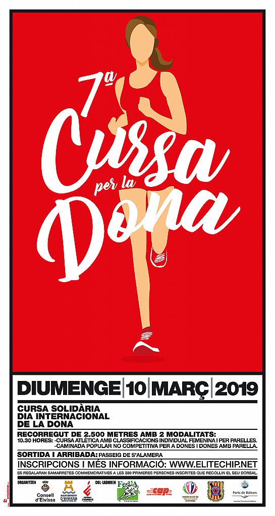 El Patronat Municipal d'Esports de l'Ajuntament d'Eivissa i el Consell Insular d'Eivissa, amb la direcció tècnica del Club Atletisme Pitiús, organitzen la cursa pedestre i Caminada denominades: VII CURSA PER LA DONA i III CAMINADA PER LA DONA que tendràn lloc diumenge, 10 de març de 2019.