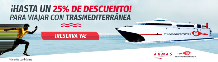 Descomptes directes aplicats sobre les compres realitzades per qualsevol línia de Trasmediterranea a Balears. Vàlid per trajectes propis de Trasmediterránea, no combinacions intermodals, Bus + Ferry, ni combinacions amb Trasmapi a Formentera. Podrà utilitzar els descomptes a en www.trasmediterranea.com , al  902454645 o a les taquilles de Trasmediterránea. Admet ancillaries. Exigeix import mínim de 100€. Accepta bonificacions (el descompte obtingut s’aplicarà sobre la tarifa oficial abans de les bonificacions). Subjecte a disponibilitat i a les condicions del contracte de transport.