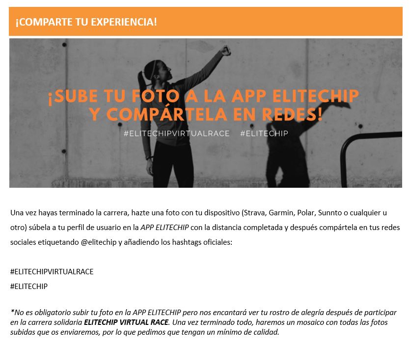 El concepto principal de la ELITECHIP VIRTUAL RACE es que tod@s l@s participantes puedan realizar la prueba en cualquier momento y en cualquier lugar, pero siempre, de forma segura y respetando las restricciones establecidas por el Gobierno.