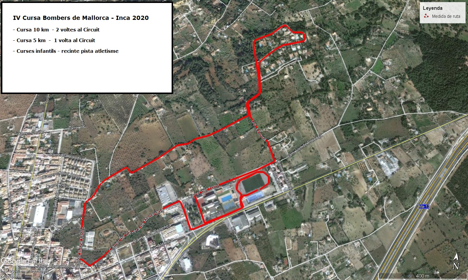 Recorregut El recorregut de la cursa tindrà ubicada la seva sortida al polisportiu Municipal Mateo Canyellas d'Inca. transcorrerà pels diferents carrers i zones d'inca. La zona de sortida i meta estarà ubicat al mateix lloc i hi haurà un area de serveis (guarda-roba, serveis, avituallament, etc).
